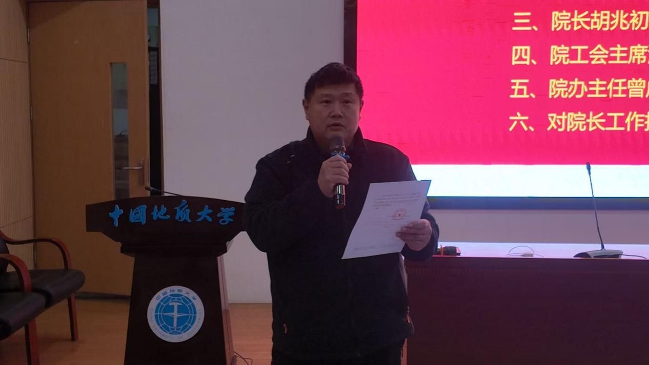 学院分工会主席沈毅宣读学校工会《关于同意召开材化学院第四届教职工大会第二次会议暨第四届工会会员大会第二次会议的批复》,并传达学校工会对材化学院教职工的殷切希望。